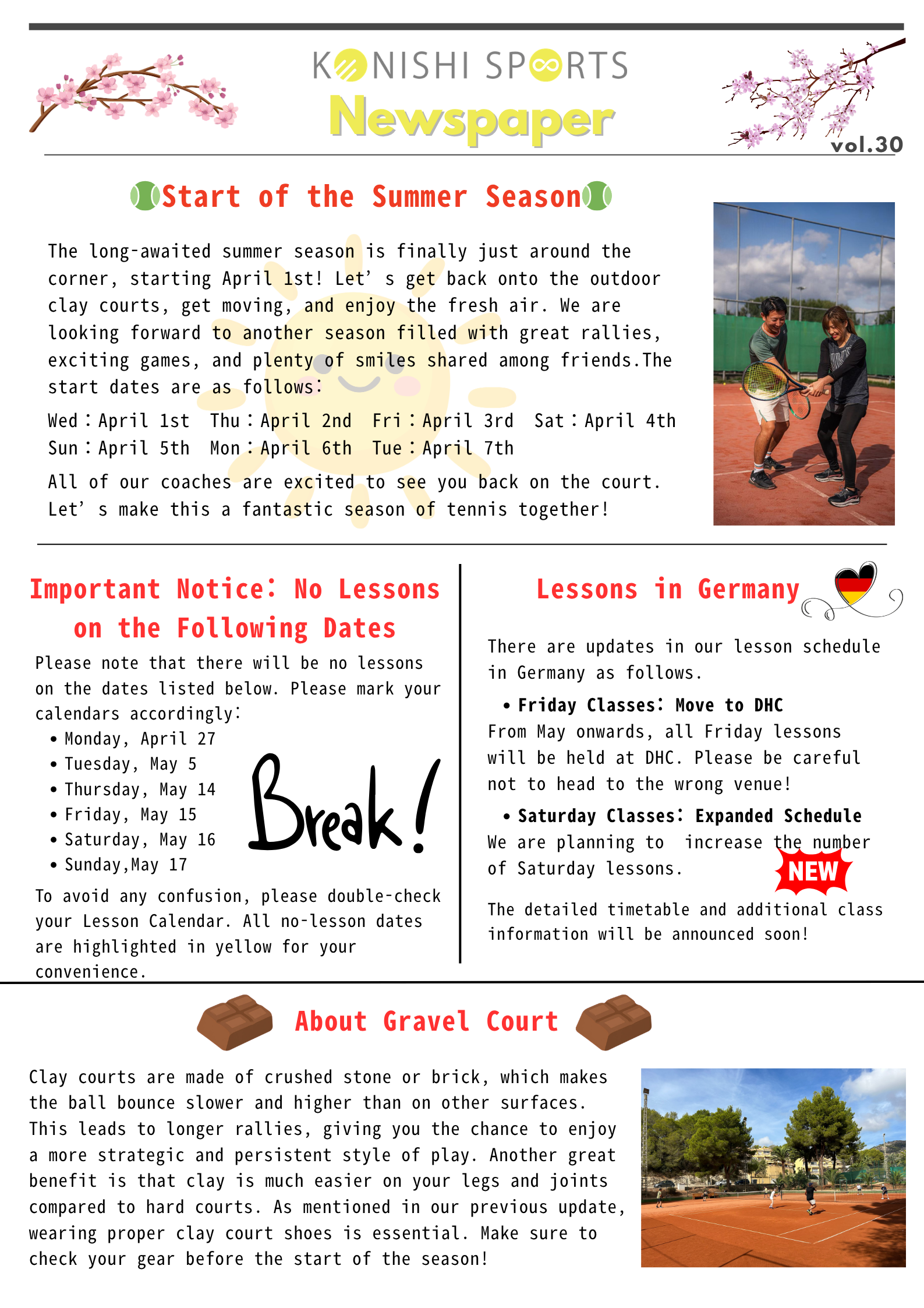 今年も【ジュニア・サマーキャンプ】開催のお知らせです! 対象年齢: 4〜16歳 期間中はテニスレッスンを中心に、楽しく身体を動かしながら過ごします。 参加者全員にオリジナルTシャツプレゼント! 開催日程(2025年): […]