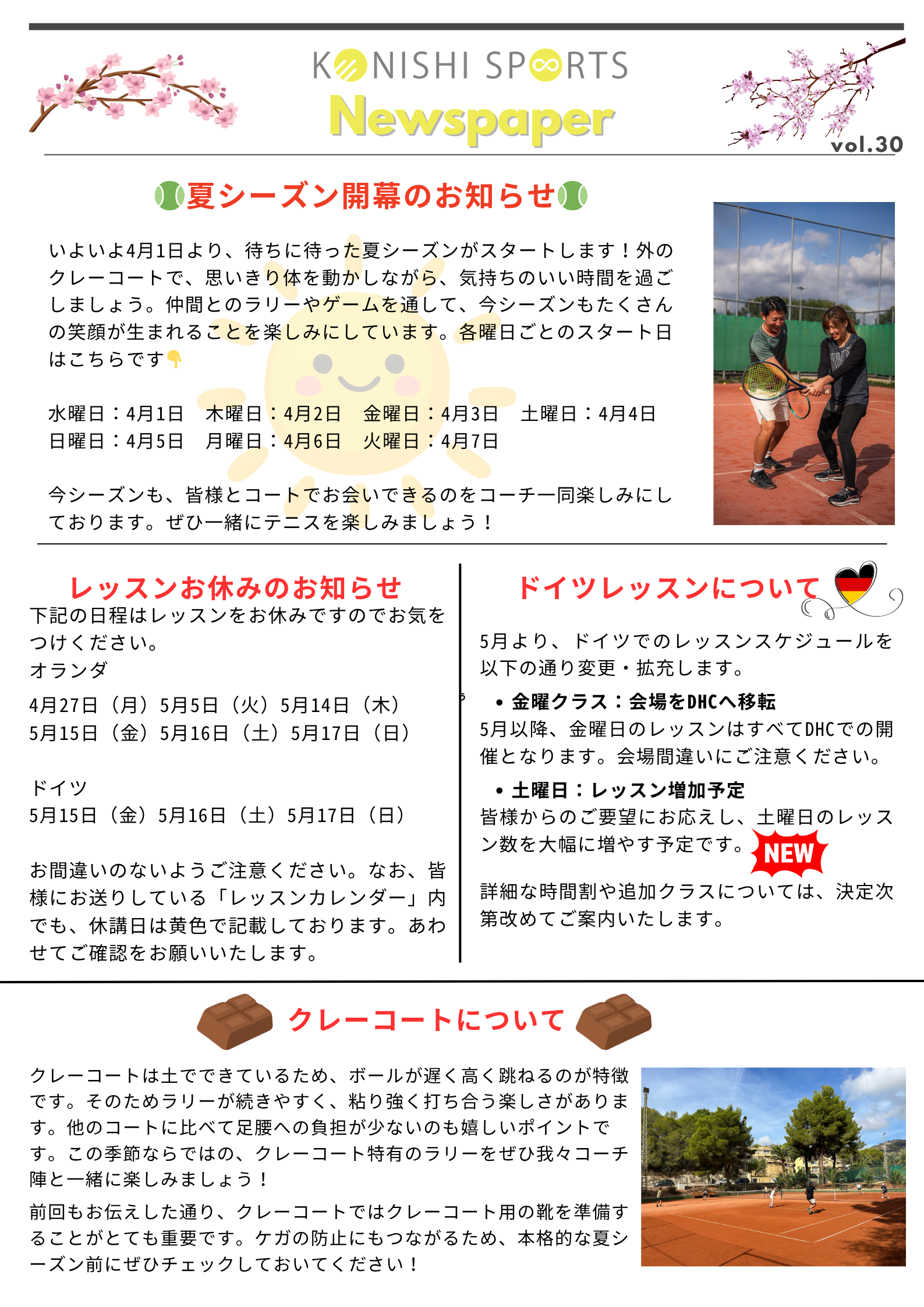 KONISHI SPORTSでは、この夏、ドイツ・デュッセルドルフにてテニスを楽しみながら学べる「ジュニア・サマーキャンプ」を開催いたします。 初心者のお子さまから経験者まで、レベルに合わせた丁寧な指導を行います。スポー […]